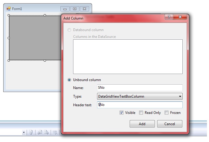First add the Data Gridview in the windows form, then add the Text Box Column and name it SNo.