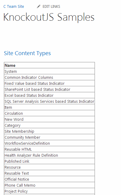 Thus in this blog you saw how to get all the Site Content Types using KnockoutJS and CSOM in SharePoint 2013.