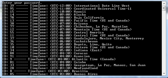 45.                     Console.WriteLine("ID: " + timeZone.Id + " ------ TimeZone: " + timeZone.Description);
