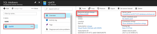 Click SQL Databases -> vijaiDB (which I have created in my previous article). Click Overview and you could see the server name and resource group which will be required for managing the SQL databases using PowerShell.