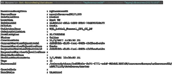 - PS Azure:\> Get-AzureRmSqlDatabase -ResourceGroupName "myResourceDB" -ServerName "mysqldbserver20171103"