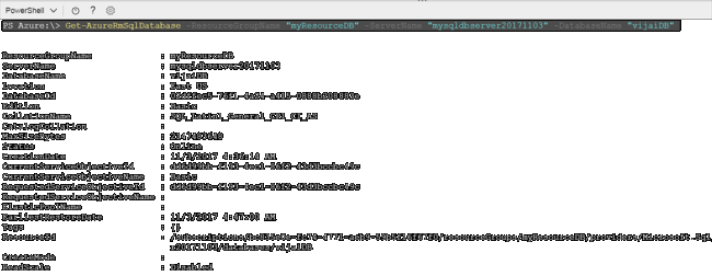 - PS Azure:\> Get-AzureRmSqlDatabase -ResourceGroupName "myResourceDB" -ServerName "mysqldbserver20171103" -DatabaseName "vijaiDB"