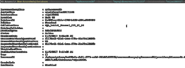 - PS Azure:\> New-AzureRmSqlDatabase -ResourceGroupName "myResourceDB" -ServerName "mysqldbserver20171103" -DatabaseName "vijaiDB001"