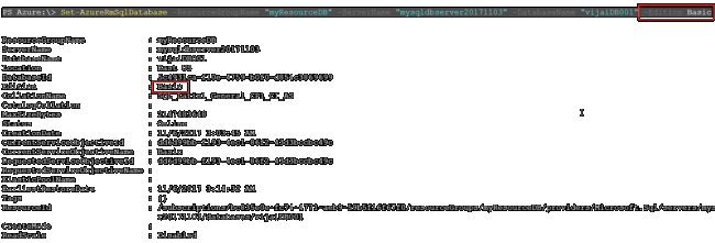 - PS Azure:\> Set-AzureRmSqlDatabase -ResourceGroupName "myResourceDB" -ServerName "mysqldbserver20171103" -DatabaseName "vijaiDB001" -Edition Basic