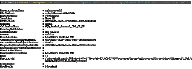 - PS Azure:\> Remove-AzureRmSqlDatabase -ResourceGroupName "myResourceDB" -ServerName "mysqldbserver20171103" -DatabaseName "vijaiDB001"