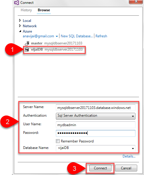 Visual Studio will be launched. Select Azure SQL database and enter all the required details and click Connect.