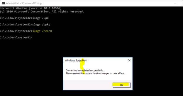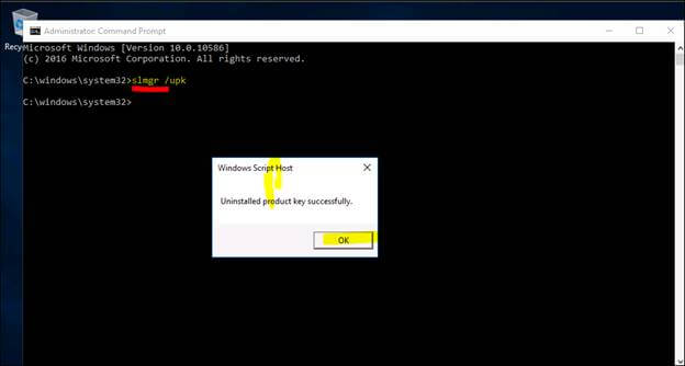 Enter slmgr /upk and hit enter. Subsequently, wait for this to complete. This will uninstall the current product key from Windows and will move Windows to the unlicensed mode.