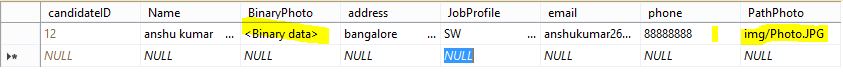 This is the table that is used to store images and details Column BinaryPhoto -Data type Varbinary(max) to store image in database in Byte format and Column PathPhoto – data type nvarchar(50) to store URL/Path of image