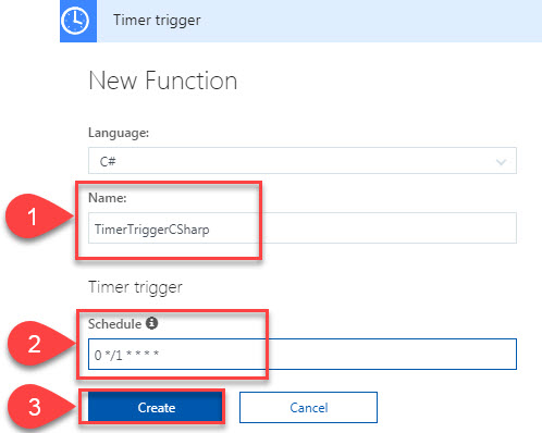 Enter the name for the new function, CRON expression for schedule and then click Create button.
