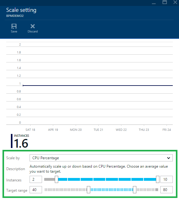 Now we can change the number of instances to automatic, so select the metric you want in the Scale by dropdown. For example, for an App Service plan you can scale by CPU Percentage. Then we will get a slider, and/or text boxes to enter the number of instances you want to scale between and Click the Save command for set Auto Scaling.