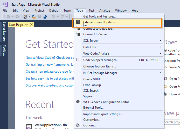 Open Visual Studio 2017. Go to Tools menu, click Extensions and Updates submenu item.