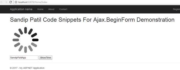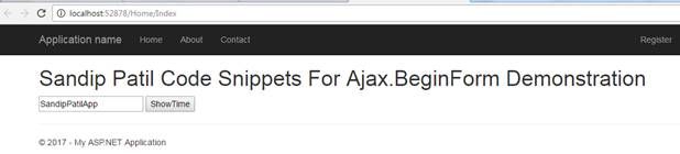 - @ * Below are script references included * @ < script src = "~/Scripts/jquery-1.10.2.js" > < /script> < script src = "~/Scripts/jquery.unobtrusive-ajax.min.js" > < /script> < h1 > Sandip Patil Code Snippets For Ajax.BeginForm Demonstration < /h1>