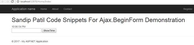 - @using(Ajax.BeginForm("ShowTime", "Home", FormMethod.Post, new AjaxOptions {