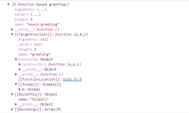 In the above code sample for bind() we are returning a bound function with the context which will be invoked later. We can see the bound function in the console as below .