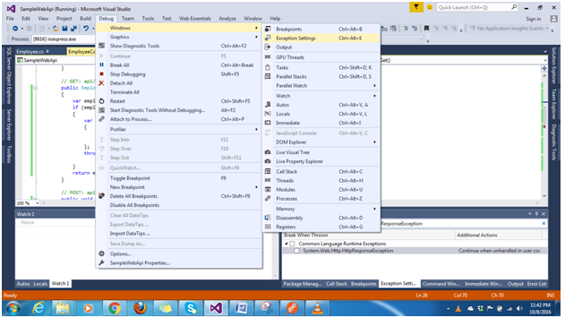 Exception handling is one of the most important things, which we use while creating any Application. If we try to throw an exception from an Action method within Web API, you may face the exception- "HttpResponseException was Unhandled by user code."