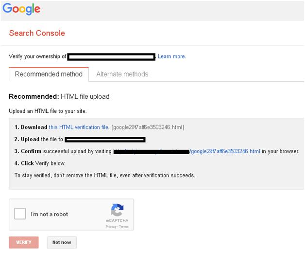 Step 7 - We can use 2 type of methods to add property first one is recommended method. In this method Google generate a html file and upload it into your root of website then click on the verify button