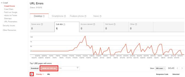 Step 11 - Now we identified the errors after solving these errors we have to know how to fix it. Select the solved errors and click on the mark as fixed button. It will take maximum 24 hours to remove it from the crawl errors list.