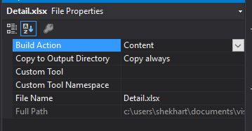 - string filename = System.IO.Path.GetDirectoryName(System.Reflection.Assembly.GetExecutingAssembly().Location) + "\\Detail.xlsx";