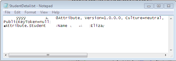 Here we are serializing student class properties using BinaryFormatter. Once we compile the code student class property "StudentName" gets serialized and stored inside "StudentDetails.txt" which is atleast not human readable.