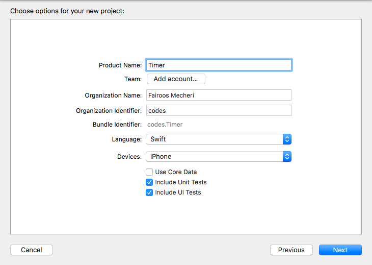 Open Xcode and create a new Single View Application and name it Timer (You can name it anything you like).