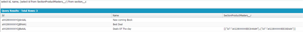 - select id,name,(select id from SectionProductMasters__r) from section__c