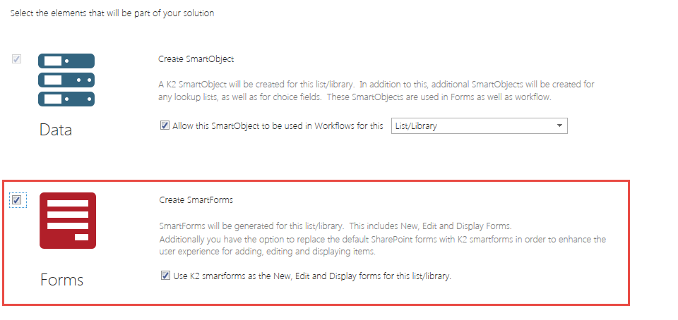Note: If you uncheck the Use K2 smartforms as the New, Edit and Display forms for this list/library check-box, the SmartForms will still be generated but the standard SharePoint Forms will be used to interact with the List/Library.