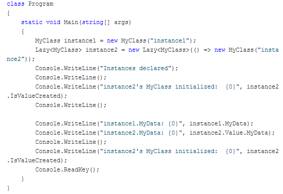 Here’s an example showing a complete program using the MyClass above, demonstrating the usage of Lazy<T>: