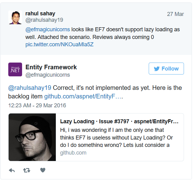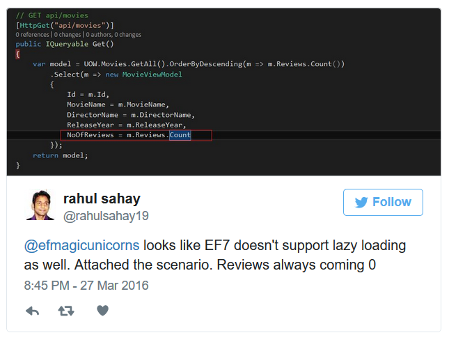 I thought to shar yet another of my experiences with Entity Framework 7 where Lazy Loading is still not implemented. I was actually designing my Movie-Review API and soon after that I realized that results are unexpected, hence without wasting time, I directly checked with Microsoft. Here is my conversation with Microsoft.