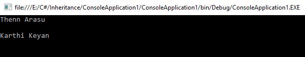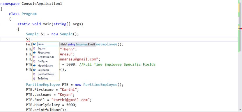 In this ParttimeEmployee inherits from Employee Base class. you can say class sample inherits from ParttimeEmployee Class.Now Class Sample Wll have available parttimeEmployee code And Employee code also available in sample class.Lets create sample class object in main class We can all propertise which are available PartimeEmployee and Employee base class,