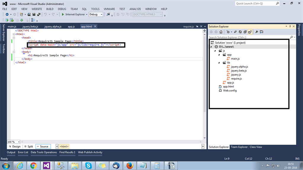 Firstly have a look the hierarchy of the application, we have app.html as starting page. In html page we have just loaded and require.js and define data-main which js will load first on this page. Remember we are not defined .js extension in this.