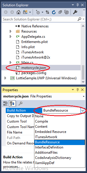 Now, add the JSON file in the iOS project and make sure you have the build action in Bundle Resource.