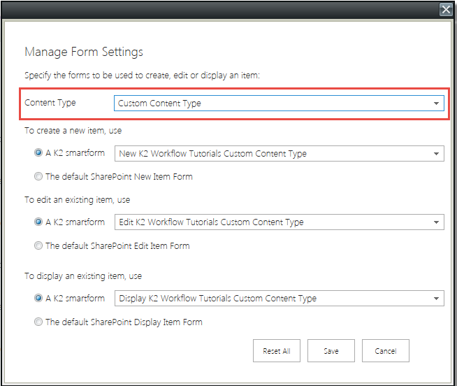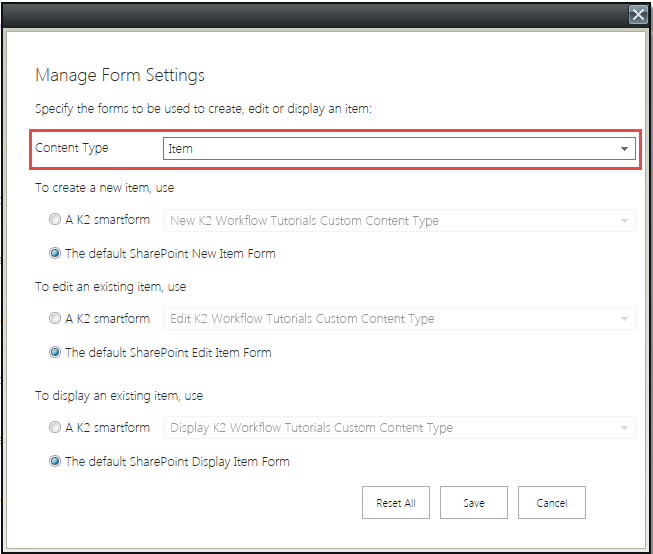 I have a custom list named “K2 Workflow Tutorials” in which I have added the following content types: Item & Custom Content Type. Each Content Type can be set to make use of standard SharePoint forms or K2 SmartForms. In this blog you will see how to manage SharePoint Forms based on Content Type in the K2 Application.