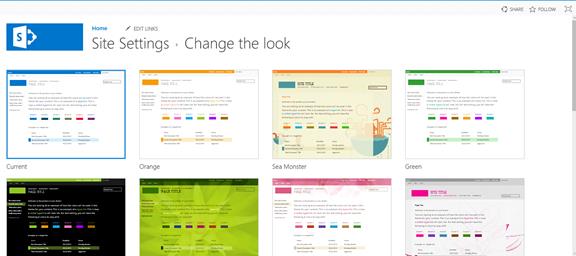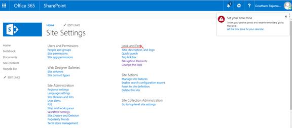 You can access the Look and Feel section of the Site Settings page in your SharePoint Online /O365 from the Site Actions menu. You must have designer or owner permission to change any of these items.