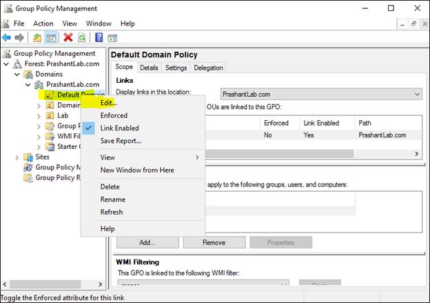 - Navigate the option to server, Group Policy Management> Forest: server Name> Domains>server Domain> and select Default Domain Policy. Here we will right click on the same and click on edit.