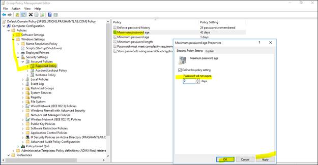 Today I am writing about how to modify Maximum password age on windows server domain controller. We have faced this issue in our organization; our DC password used to expire every 42 days which was restricting access to users, SharePoint sites, and Project server sites. In one word we can say everything was getting messed up. So we Googled and found the solution but as per the solution, the option was grayed out where we could modify the server password or put a password that would never expire.