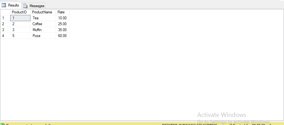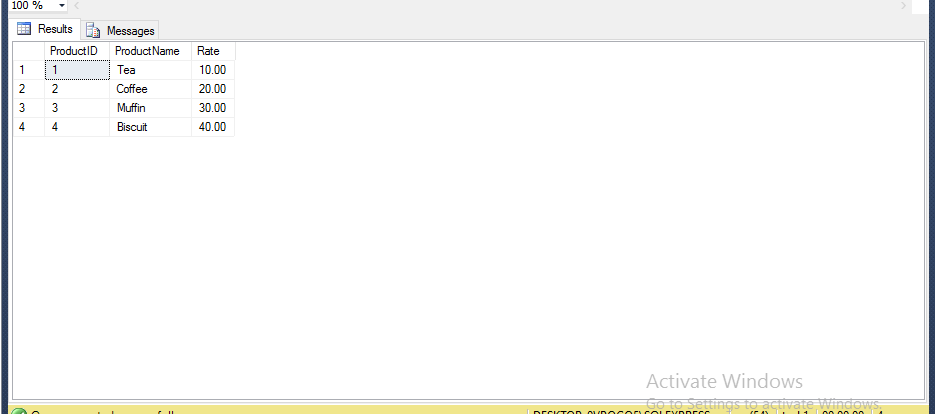 - INSERT (ProductID, ProductName, Rate)