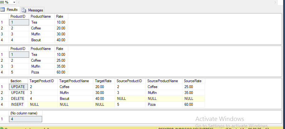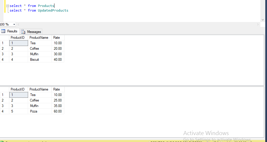 When we execute the Products table, UpdatedProducts table, and the Merge statement, the output will be something like this.