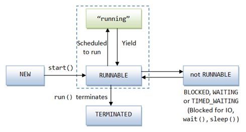 Firstly, a program comes in a new state, then it moves to a runnable state. If we give the “run” command on the runnable state, then it will move to a running state, at the running state, if we give the “yield” command, then the program returns to the runnable state. For blocking the thread from being in the runnable state, we can use suspend, sleep or wait. If we use the “stop” method at any state, then our program will move to the “dead” state.