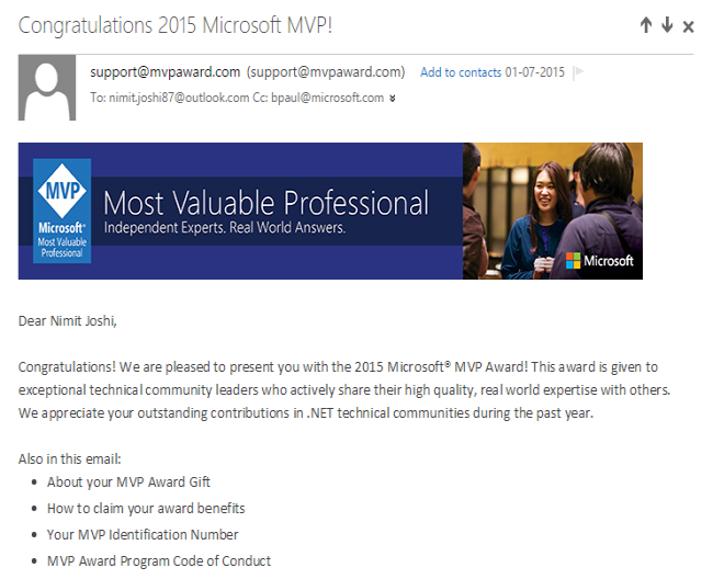 I have published many articles on MVC 5 and they have been selected as "Articles of the Day" on www.asp.net. I nominated myself for Microsoft MVP, and YES, finally I got it. On July 1, 2015, I received an email from Microsoft that "You have been awarded as a Microsoft MVP."