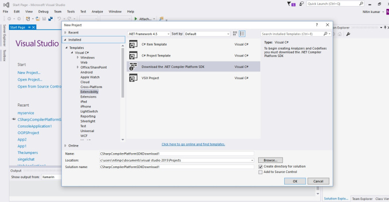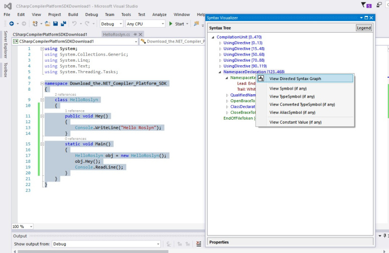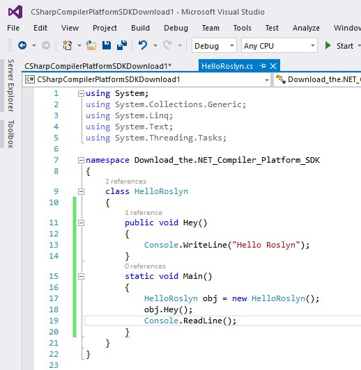 Click ok. Under the project create a new class say HelloRoslyn.cs then write the code under this class.