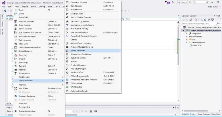 Now the next step is for syntax visualizer. Go to menu click view select list -> other Windows -> then select syntax visualizer.