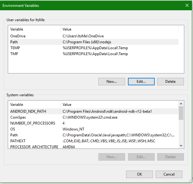 Open Control Panel -> User Accounts -> Change my environmental variable and verify the path Variable value “C:\Program Files (x86)\nodejs” or “C:\Program Files \nodejs “.