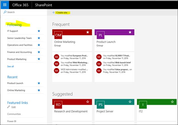 - So here we can create team site as well, showing on the top of the page, called “Create Site”