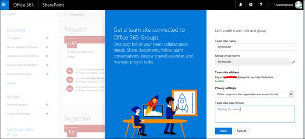 - To create new Site page on SharePoint online page: click on the Create site option highlighted on the above screen shot and add team site name and description then click on next: