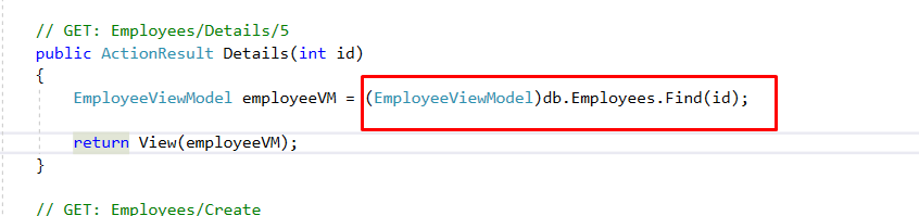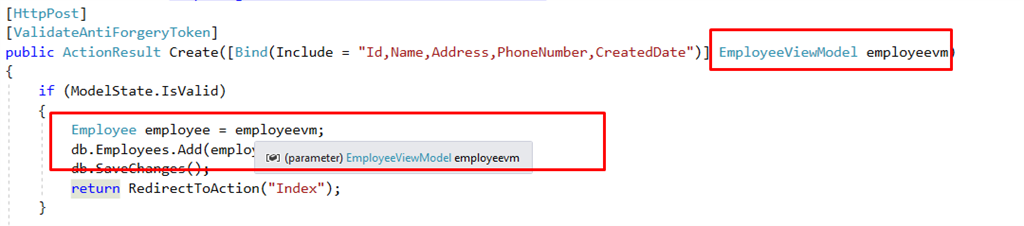 We have two classes - the entity class Employee and EmployeeViewModel class. Then, whenever we display employee data to View, we first convert the Employee type to EmployeeViewModel.