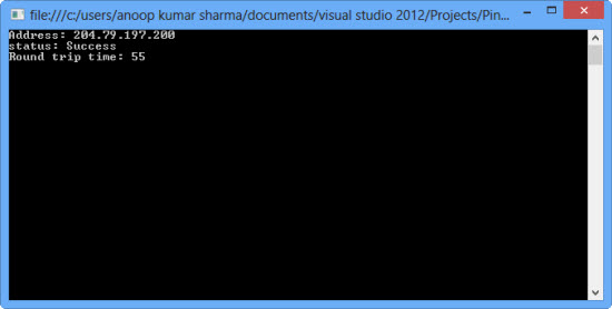 Ping class provide Send() method with Hostname/Address and timeout as a parameter. Send() method returns PingReply object which provides information about the ICMP(Internet Control Message Protocol) echo message if message was received or it will provides the reason for the failure if no message was received. If ICMP echo message is not received within time specified in the timeout parameter than Status property will be set to TimedOut. If an attempt to send an ICMP echo request and receive the corresponding ICMP echo reply Successfully than Status property is set as Success.