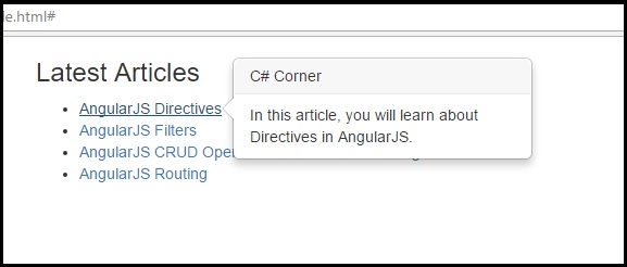 - <li><a href="#" data-toggle="articletitle" data-trigger="focus" data-placement="right" title="C# Corner" data-content="In this article, you will learn about Directives in AngularJS.">AngularJS Directives</a></li>