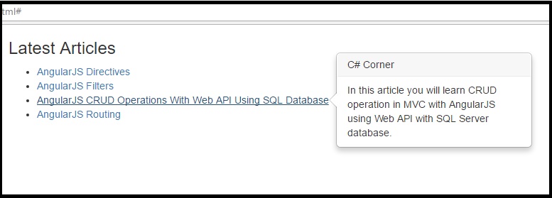 - <li><a href="#" data-toggle="articletitle" data-trigger="focus" data-placement="right" title="C# Corner" data-content="In this article you will learn CRUD operation in MVC with AngularJS using Web API with SQL Server database.">AngularJS CRUD Operations With Web API Using SQL Database</a></li>
