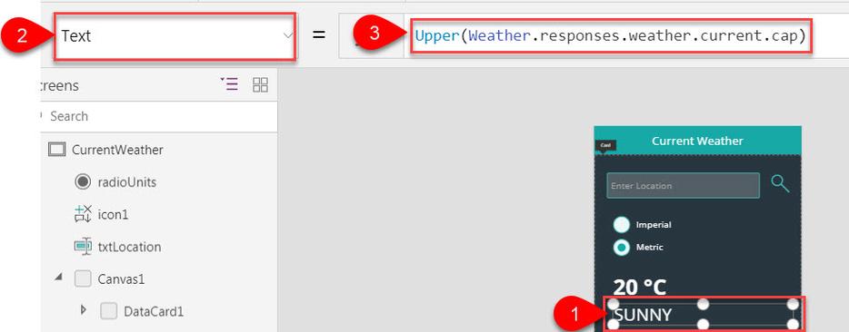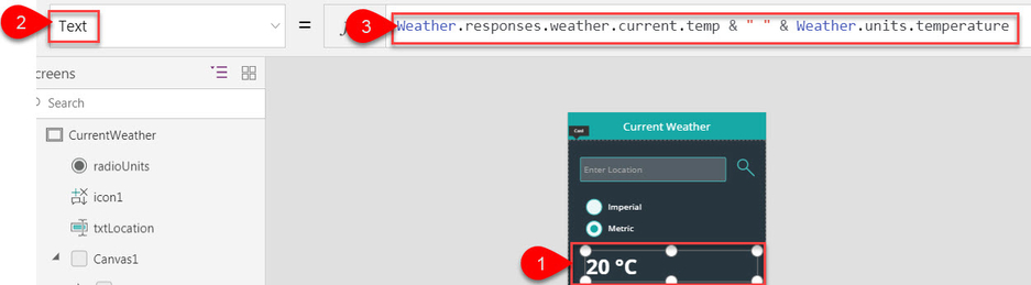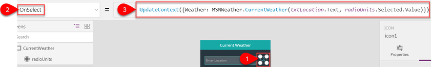 Select Search icon and for OnSelect property, enter UpdateContext({Weather, MSNWeather.CurrentWeather(txtLocation.Text, radioUnits.Selected.Value)}) in the formula bar.