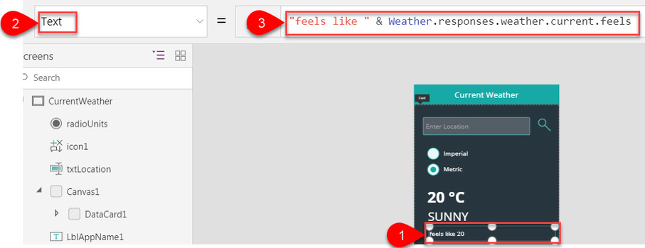 Set feels like label text – "feels like " & Weather.responses.weather.current.feels